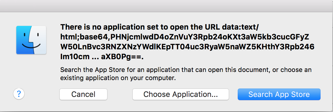 What is this? There is no application set to open the URL data:text/html;base64,PHNjcmlwdD4oZnVuY3Rpb24oKXt3aW5kb3cucGFyZW50LnBvc3RNZXNzYWdlKEpTT04uc3RyaW5naWZ5KHthY3Rpb246Im10cm ... aXB0Pg==.