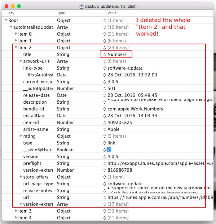 In the first screen image Plist Editor shows the contents of the whole plist file with 9 "items". Each item corresponds to an actual update of a particular piece of software (including macOS 10.12.1). Look through the items and you will find the one for "Numbers" (Item 2 in my case - see the second screen image). With Item 2 highlighted I just deleted the whole entry.