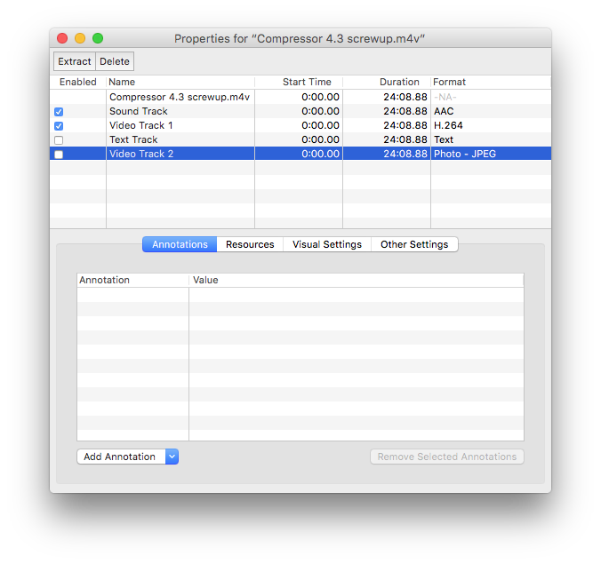 Second screen shot shows what I *thought* might have been the cause, as it only shows up in the file produced by Compressor 4.3 - NOT the file produced by Compressor 4.2.2. It seems that Compressor 4.3 is (arbitrarily?) adding a secondary video track of type "Photo - JPEG" that I didn't explicitly ask for (not sure how I'd go about doing that anyway).