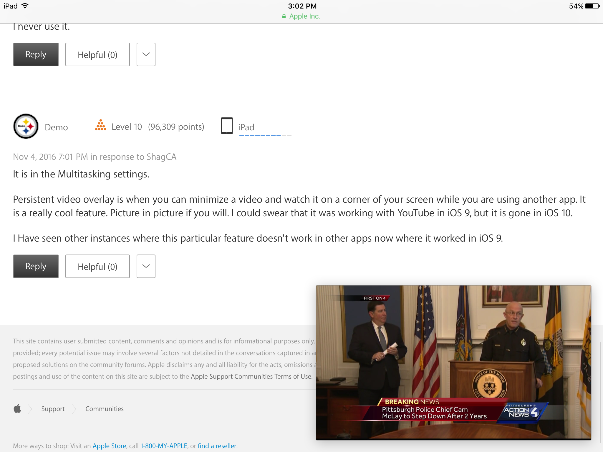 Persistent video overlay is when you can minimize a video and watch it on a corner of your screen while you are using another app. It is a really cool feature. Picture in picture if you will. I could swear that it was working with YouTube in iOS 9, but it is gone in iOS 10.