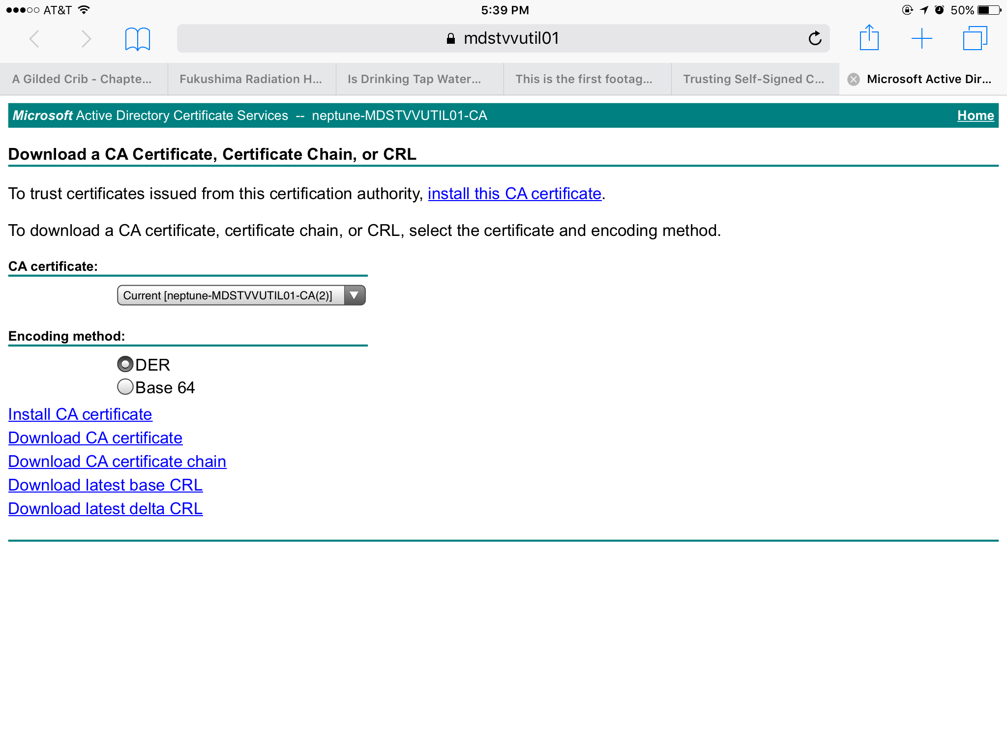 1. Copy the self-signing CA cert to a web server. I just used a machine internal to the network that already had httpd set up but wasn't exposed to the internet (shouldn't matter with a cacert, but just in case).