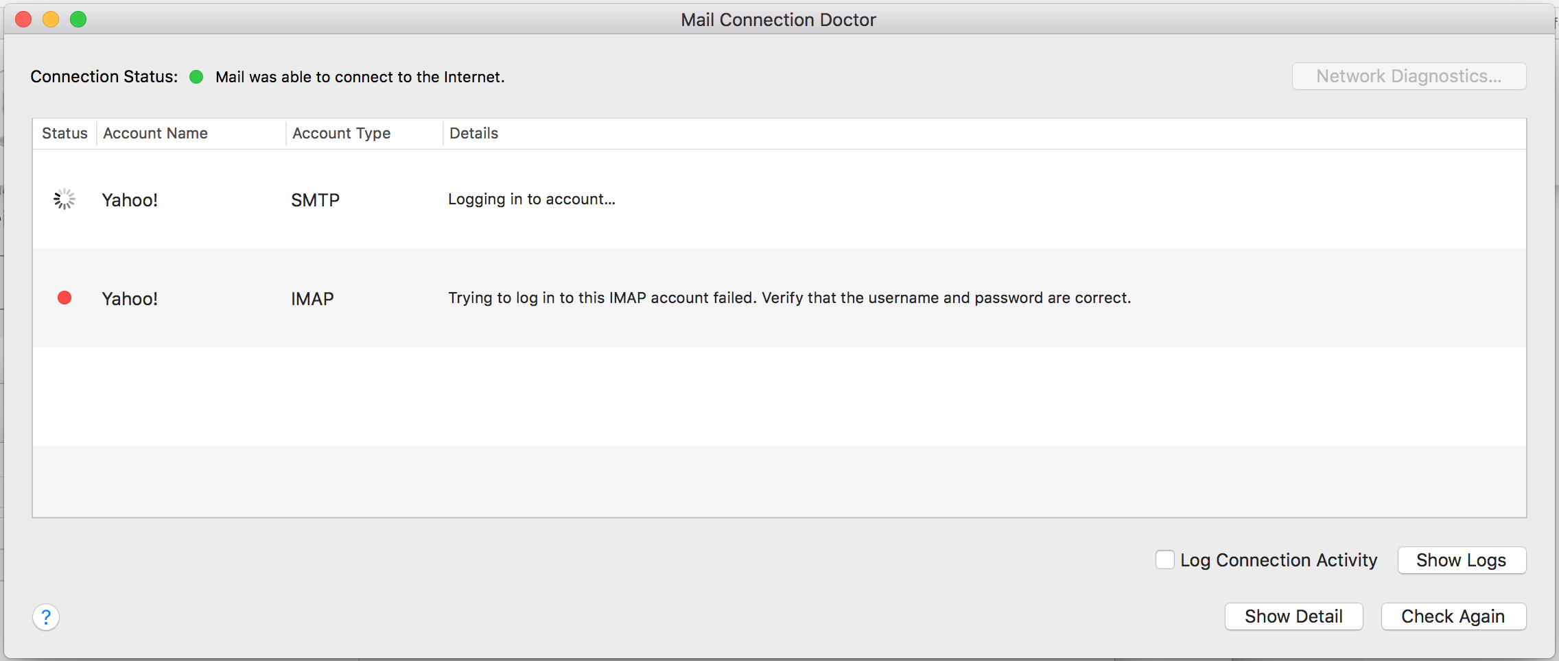 I then tried setting up mail again and I keep getting account login errors from the mail client, yet my BT/Yahoo mail detects that the Mac has successfully logged in!