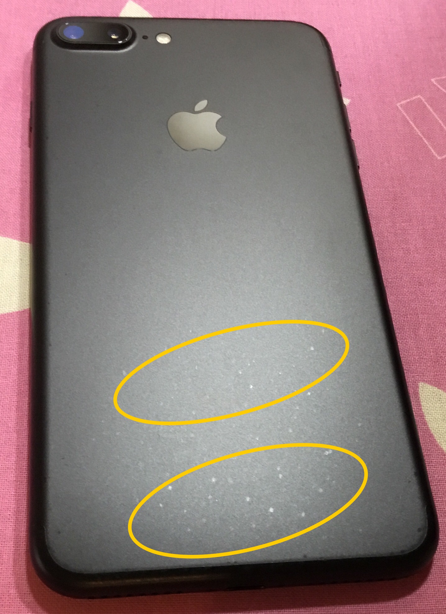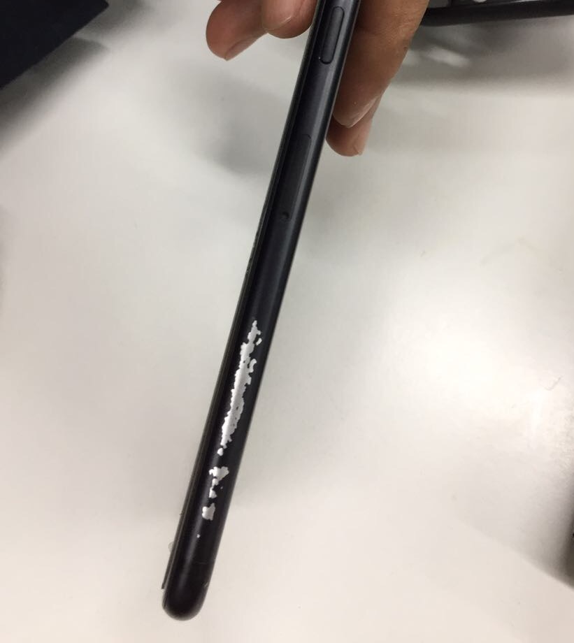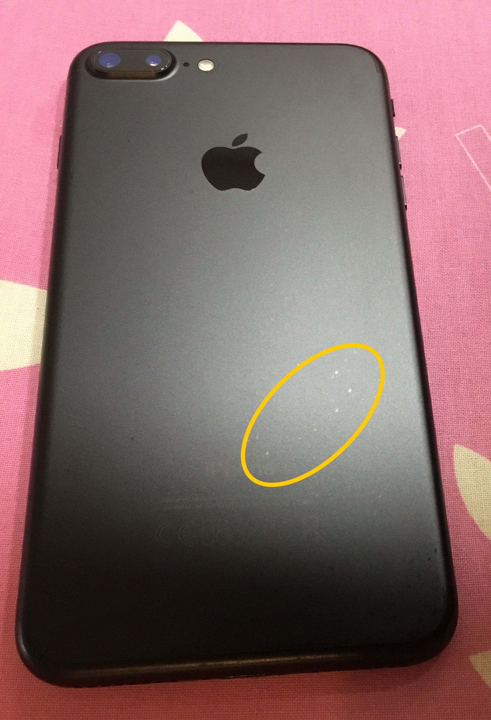 I have been using iPhone 7 Plus Matt Black for about one month with fully covered by a TPU casing and full screen tempered glass most of the time. I just open the casing once a week to wipe the dust off from the phone. Until yesterday when I take off the casing, and notice there is something at the edge of the phone body next to UP Volume button. At first I thought it just the dust. I try to wipe it using microfibre cloth as usual. Until I look closely it is the metal part of the body. It seems that the black anodised paint had been chipped off from the phone body. I am really disappointed with what happen to the phone because I was using it very careful.