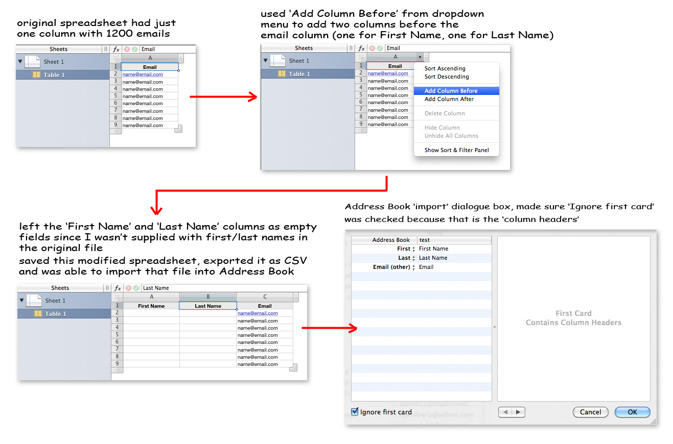 I'm pretty sure I've done this in the past but it just isn't working now. I received an excel spreadsheet file with several hundred emails in it. I want to import those emails into my address book application. I've opened the excel file in Numbers and exported it as a CSV file. Address Book won't import it saying that it's not a properly formatted CSV file. When I look at the CSV file, it appears to still be formatted in spreadsheet format. Any help would be appreciated.