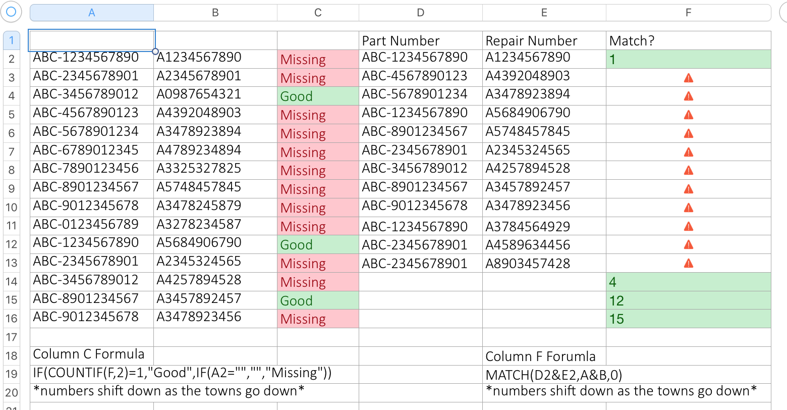 I currently have an Excel Worksheet that I am trying to bring over to Numbers. It is used to check what scanned Combinations I entered versus what I should have. The Worksheet tells me whether I am missing something I should have (or not) via the IF Function, and what row the match is from (to make sure that both columns are an exact match) via the MATCH function.