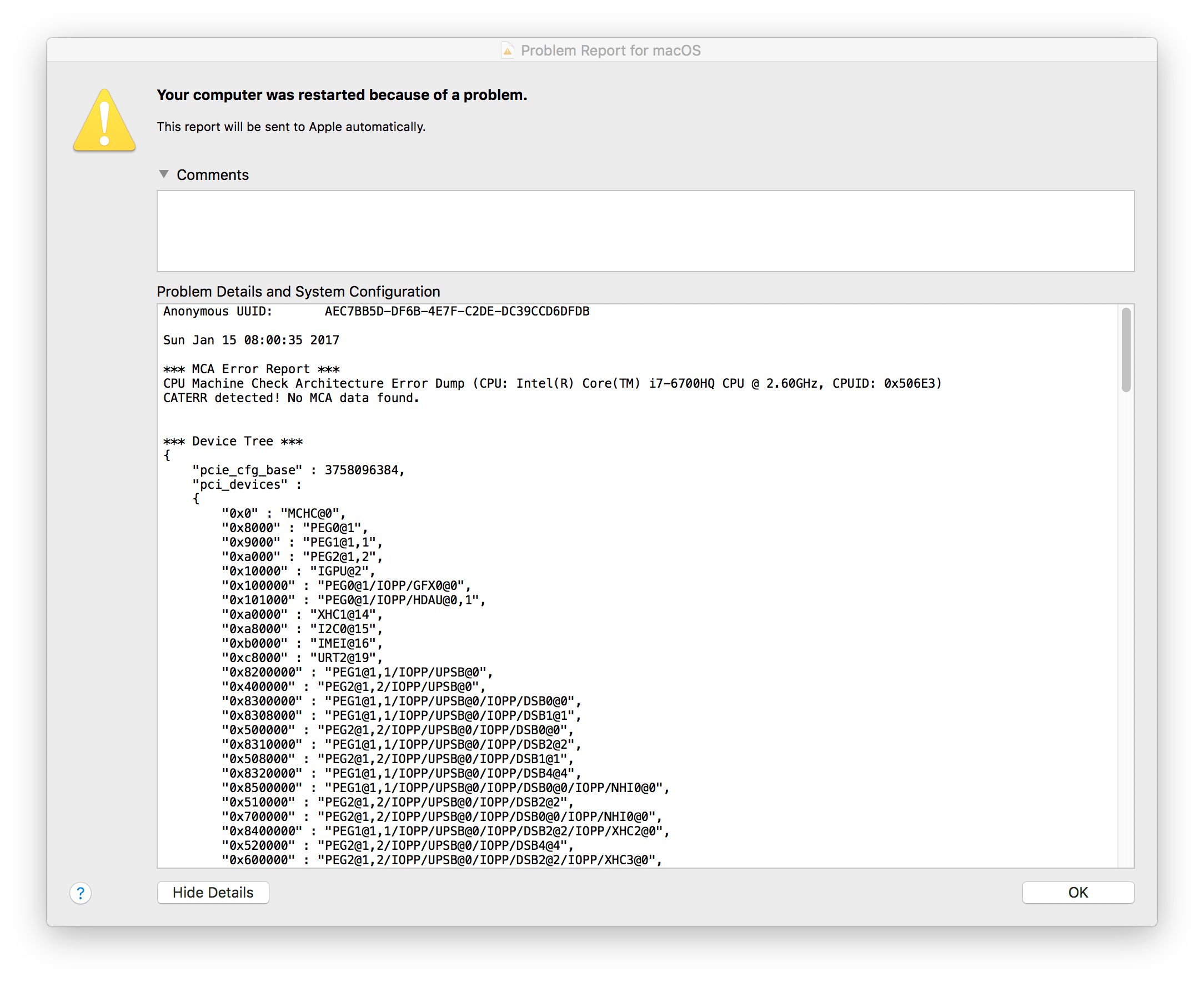 CPU Machine Check Architecture Error Dump (CPU: Intel(R) Core(TM) i7-6920HQ CPU @ 2.90GHz, CPUID: 0x506E3)