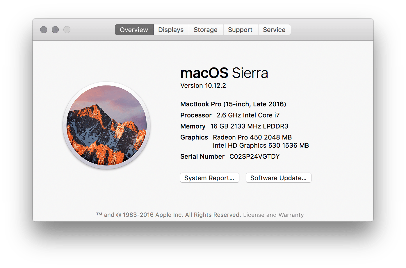 Model: MacBookPro13,3, BootROM MBP133.0226.B11, 4 processors, Intel Core i7, 2,9 GHz, 16 GB, SMC 2.38f6