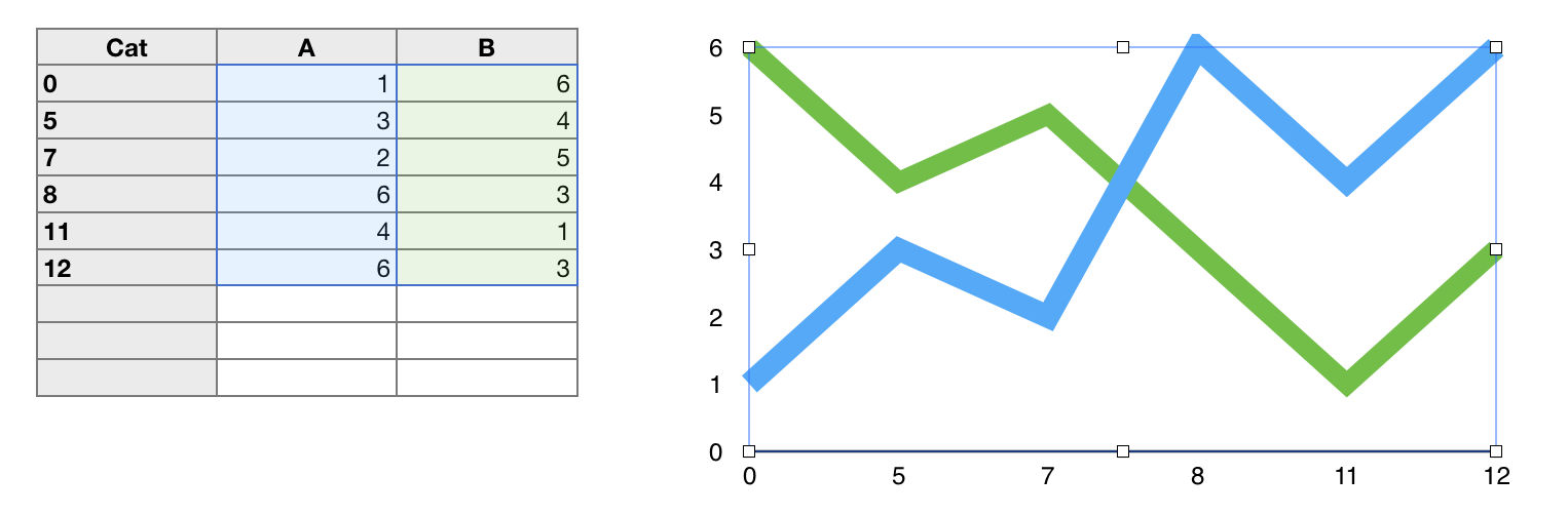 The Line Plot is a Category chart. The labels on the category ( x ) axis are 'categories', not 'values,' and are equally spaced with no regard to the numerical difference from one to the next (assuming they are 'numbers'.