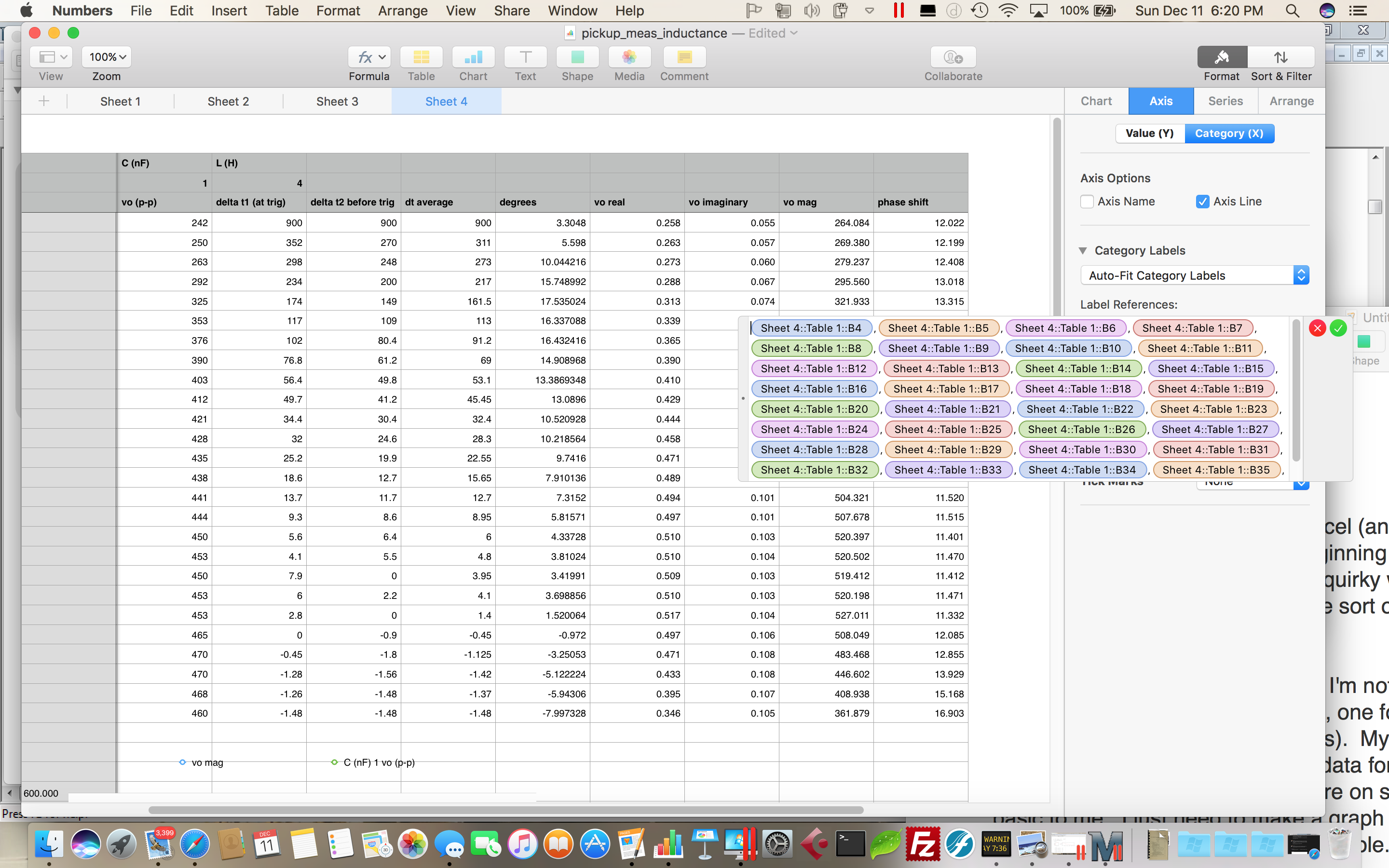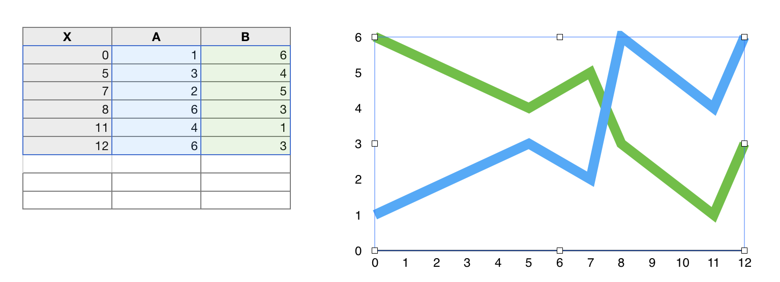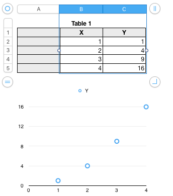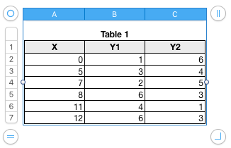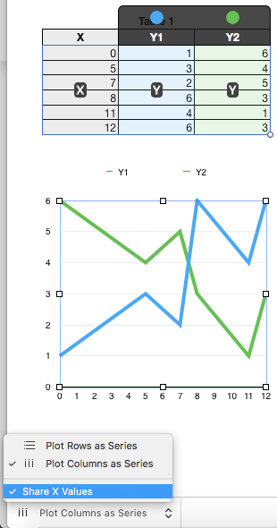 For an x-y scatter chart using two series of y values and a shared series of x values, begin by selecting a single x-y pair of columns (A and B), then choose the chart type. With the chart created, and selected, click the Edit Chrt References button below the chart, then go to the table and drag the small white handle right to add the second column of Y values: