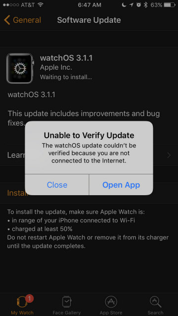 The update should successfully install on the AppleWatch (granted the watch has 50% charge and is plugged in).
