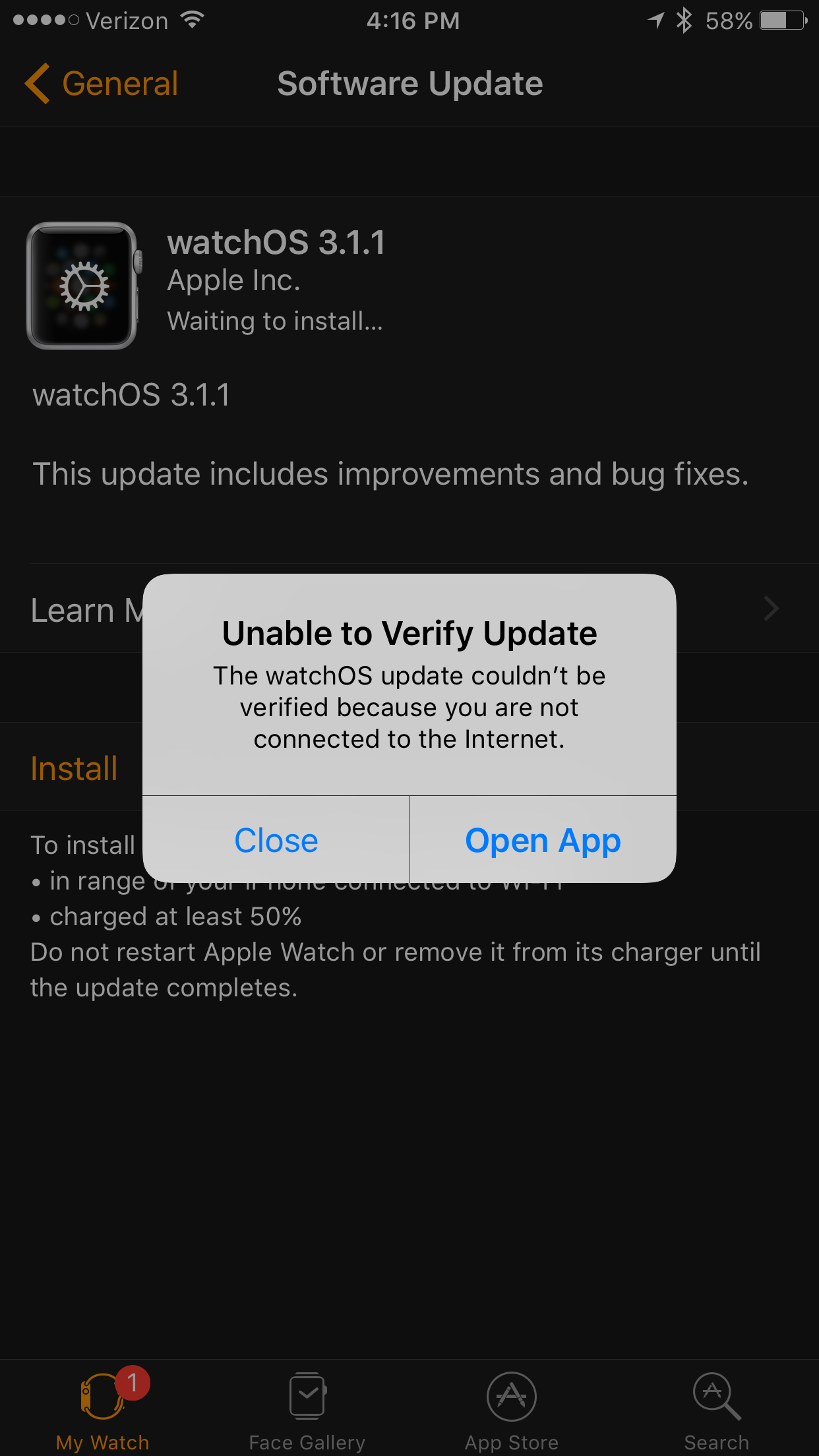The update should successfully install on the AppleWatch (granted the watch has 50% charge and is plugged in).