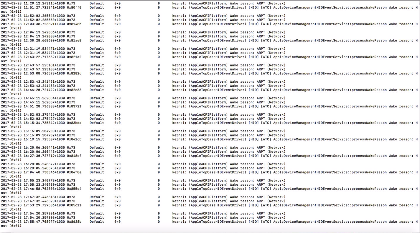 2017-01-03 19:14:16 +0800 DarkWake DarkWake from Standby [CDN] due to ARPT/Network: Using BATT (Charge:47%) 30 secs