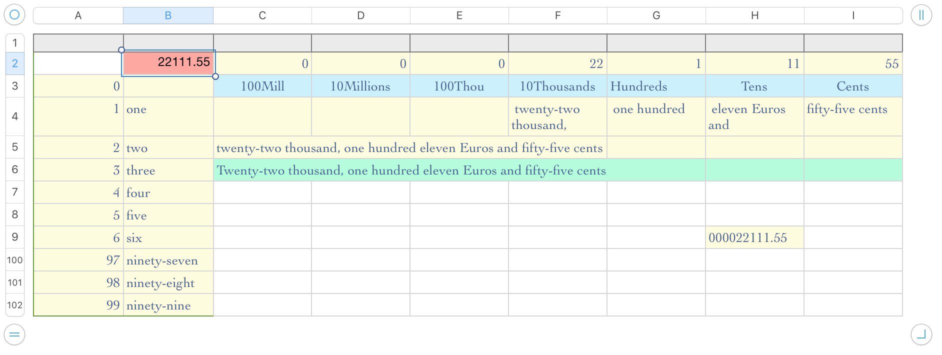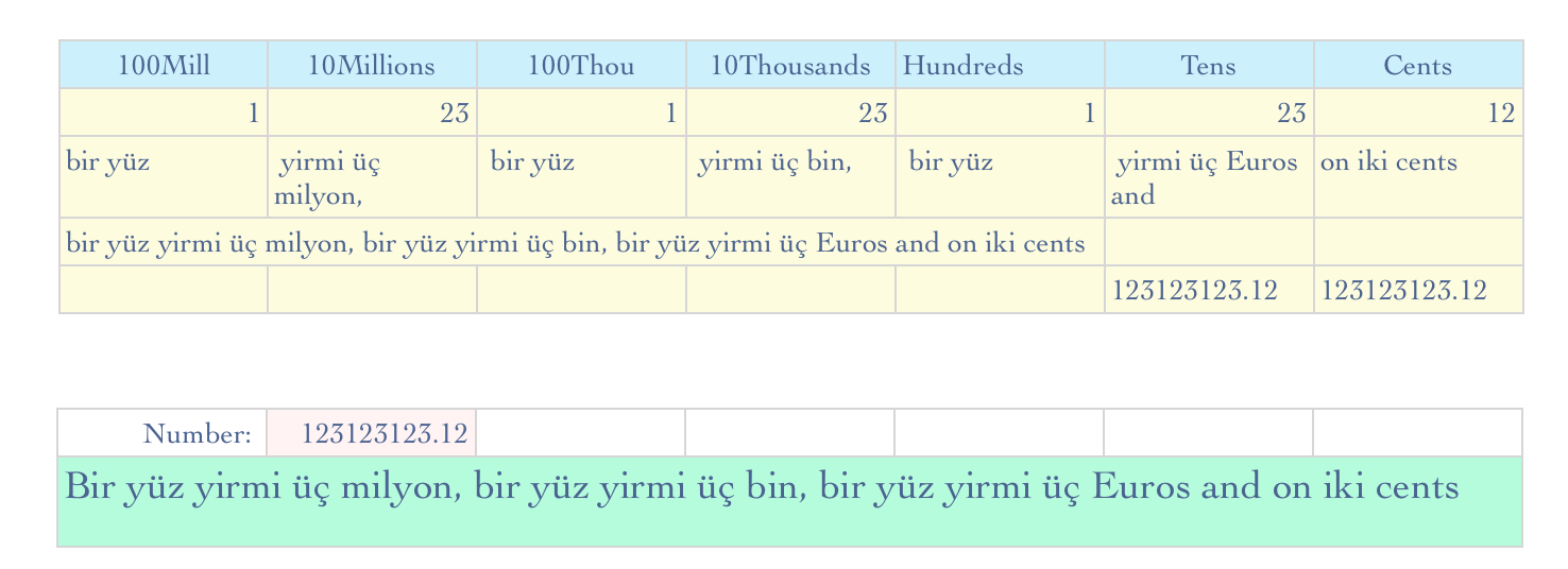 4. In cells C4 - I4, a series of formulas looks up the the text equivalent of each one or two digit number in the cell two rows above, and adds any necessary separator or period name to the result. As written, the formulas assume English language words and North American thousands and decimal separators in both the numerical and text representations of the numbers.