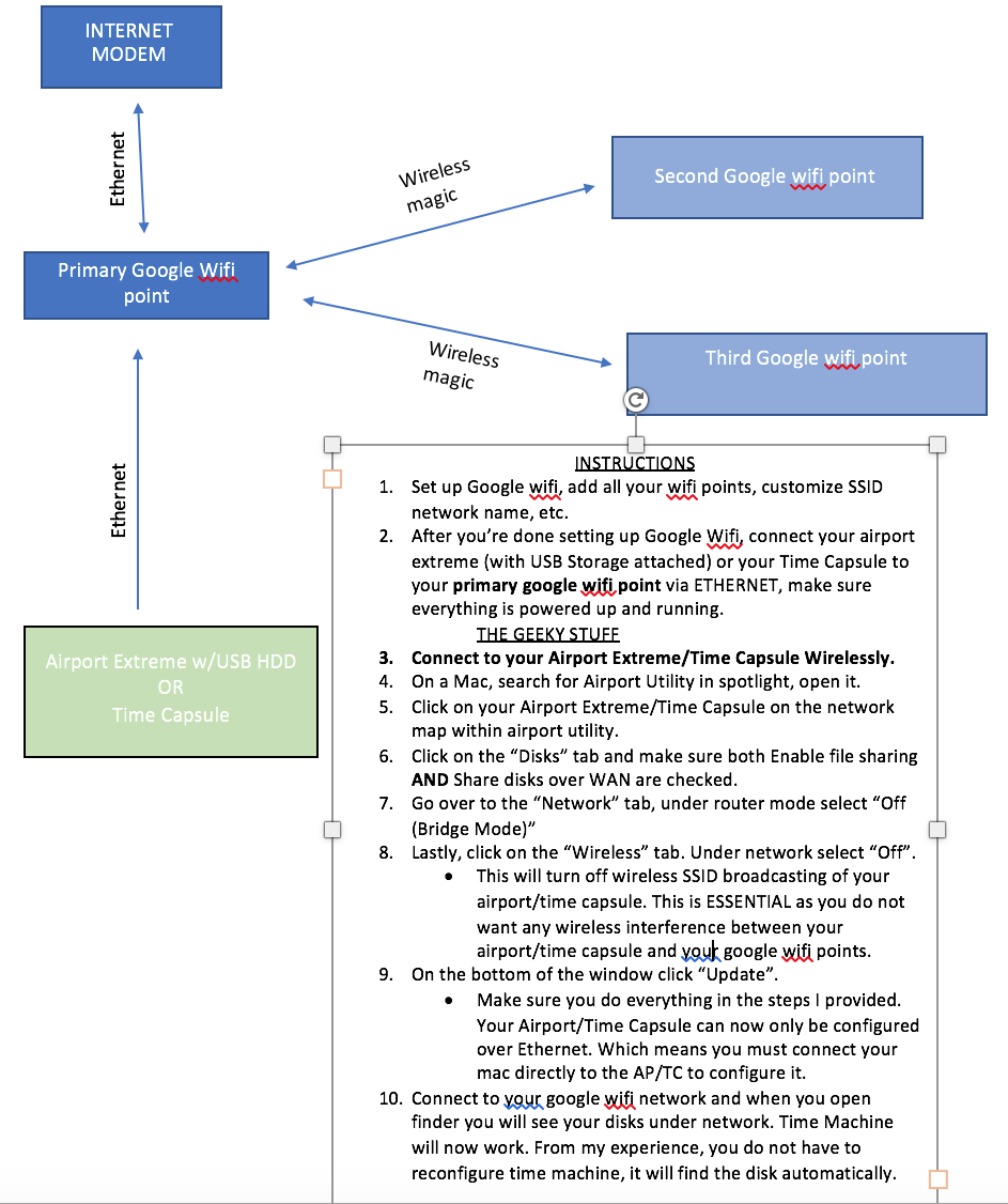 The only thing I did differently: I did steps 2 - 9 before I connected the Airport Extreme/Time Capsule to the primary Google wifi point. In other words, I turned off everything on my Apple Airport Extreme wifi system (SSID etc) before connecting it to the my new Google wifi network. This is especially important if you give your Google wifi network the same name (ID) as your previous Airport Extreme wifi network.