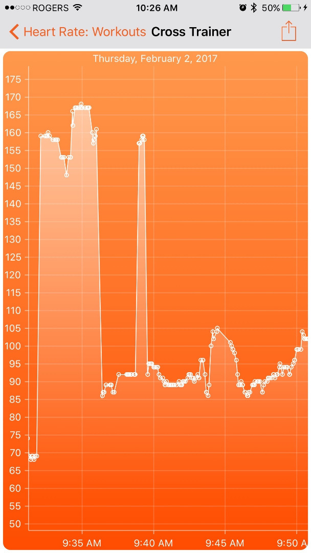 I'm seeing a lot of frequent 120-160 spikes as well as 30-40 dips in my readings. What I've noticed is that these weird values only happen with the automatic readings. If I start a continuous recording session with Cardiogram it's a steady 60-65 for hours (well, at least until the battery dies). But as soon as I turn off the continuous reading... boom, here's the 30 heart rate.