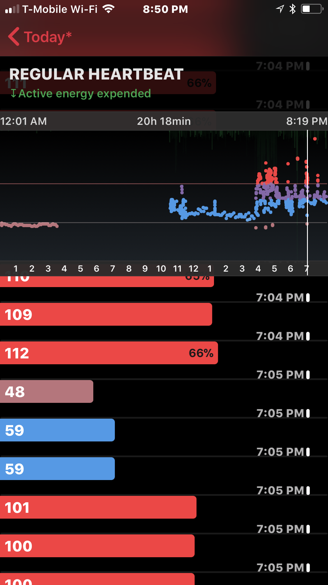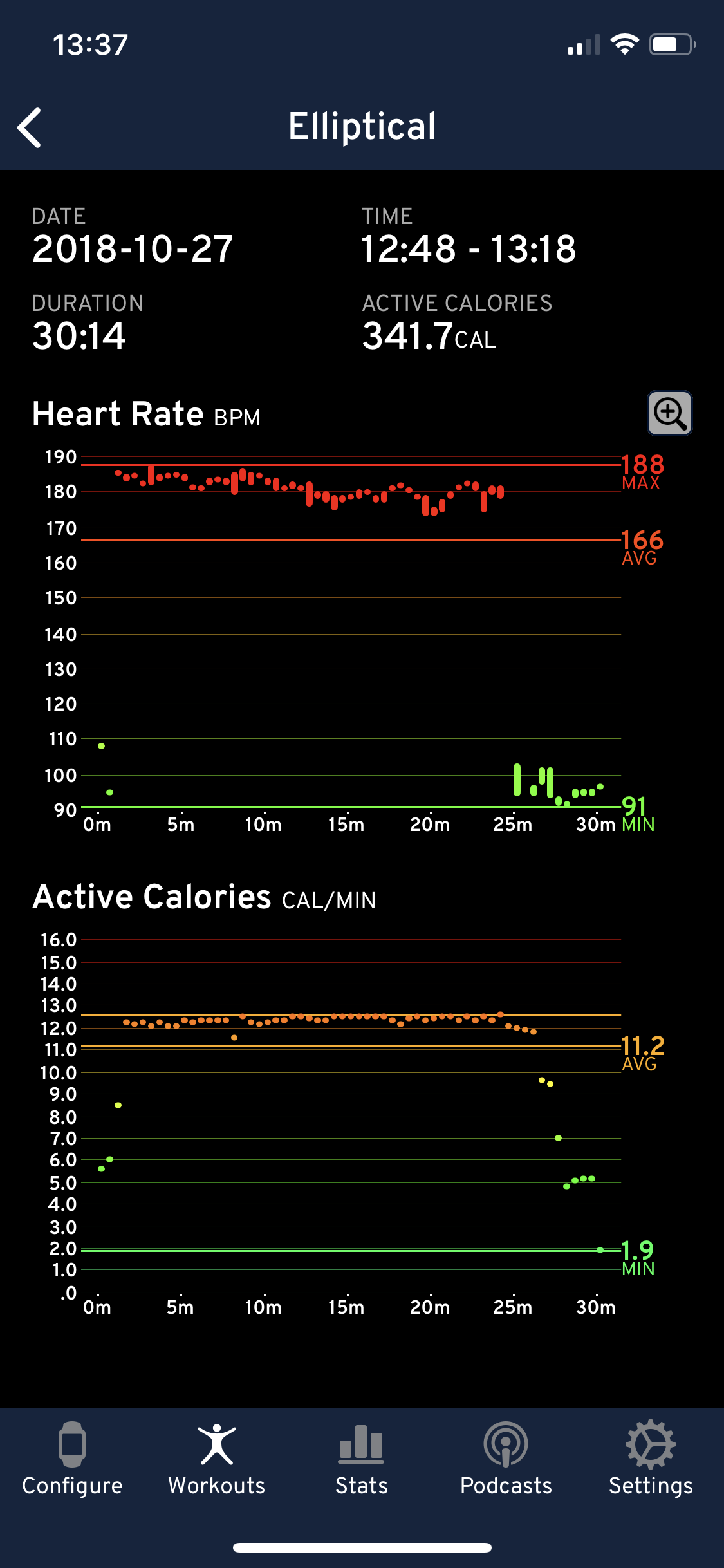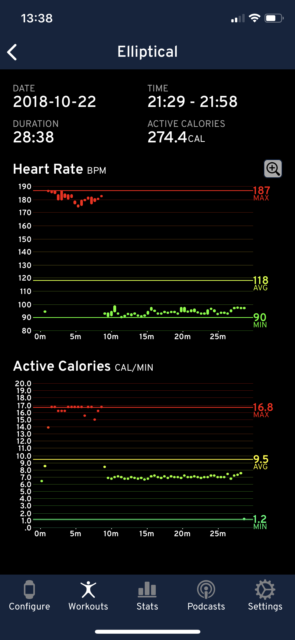 I'm seeing a lot of frequent 120-160 spikes as well as 30-40 dips in my readings. What I've noticed is that these weird values only happen with the automatic readings. If I start a continuous recording session with Cardiogram it's a steady 60-65 for hours (well, at least until the battery dies). But as soon as I turn off the continuous reading... boom, here's the 30 heart rate.