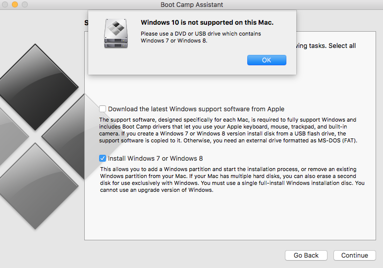 "Windows 10 is not supported on this Mac. Please use a DVD or USB drive which contains Windows 7 or Windows 8." Here's a screenshot of the exact message: