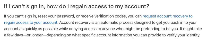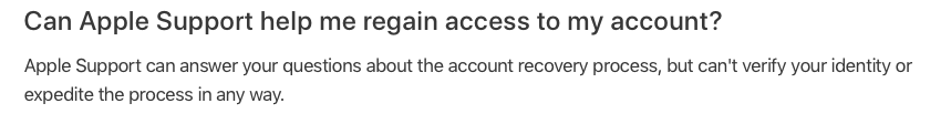 It has been 5 days since I've requested to recover my Apple ID. How long does this process take? I had two way authentication enabled and when I moved to another country, I no longer have access to my US phone number, which means I can't get the six digit code. Now that I'm locked out, I can't remove the Apple ID from my apple devices which means I can't create a new Apple ID and count the old one as a lost. There has to be a easier way. I can't download apps, I can't check emails, I can't synch devices. This is terrible. I've called apple and have given every piece of information I have to prove it's me and they still can't speed up the recovery process.