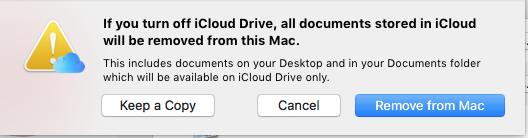 If you turn off iCloud Drive or sign out of iCloud, you have the option to keep a local copy of your files that are in iCloud Drive. Whether you decide to keep a local copy or not, a new Desktop and Documents folder is created in your home folder. If you choose to keep a local copy, your files in iCloud Drive are copied to a folder called iCloud Drive (Archive) in your home folder. Then you have the option to move any files that were in your iCloud Desktop and Documents, back to your new local Desktop and Documents.