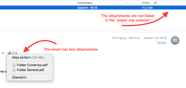 However all attachments are shown in the respective email. But if one needs to check several emails if there are objects attached or not it's much easier to have the "paper clip column" in the overview.
