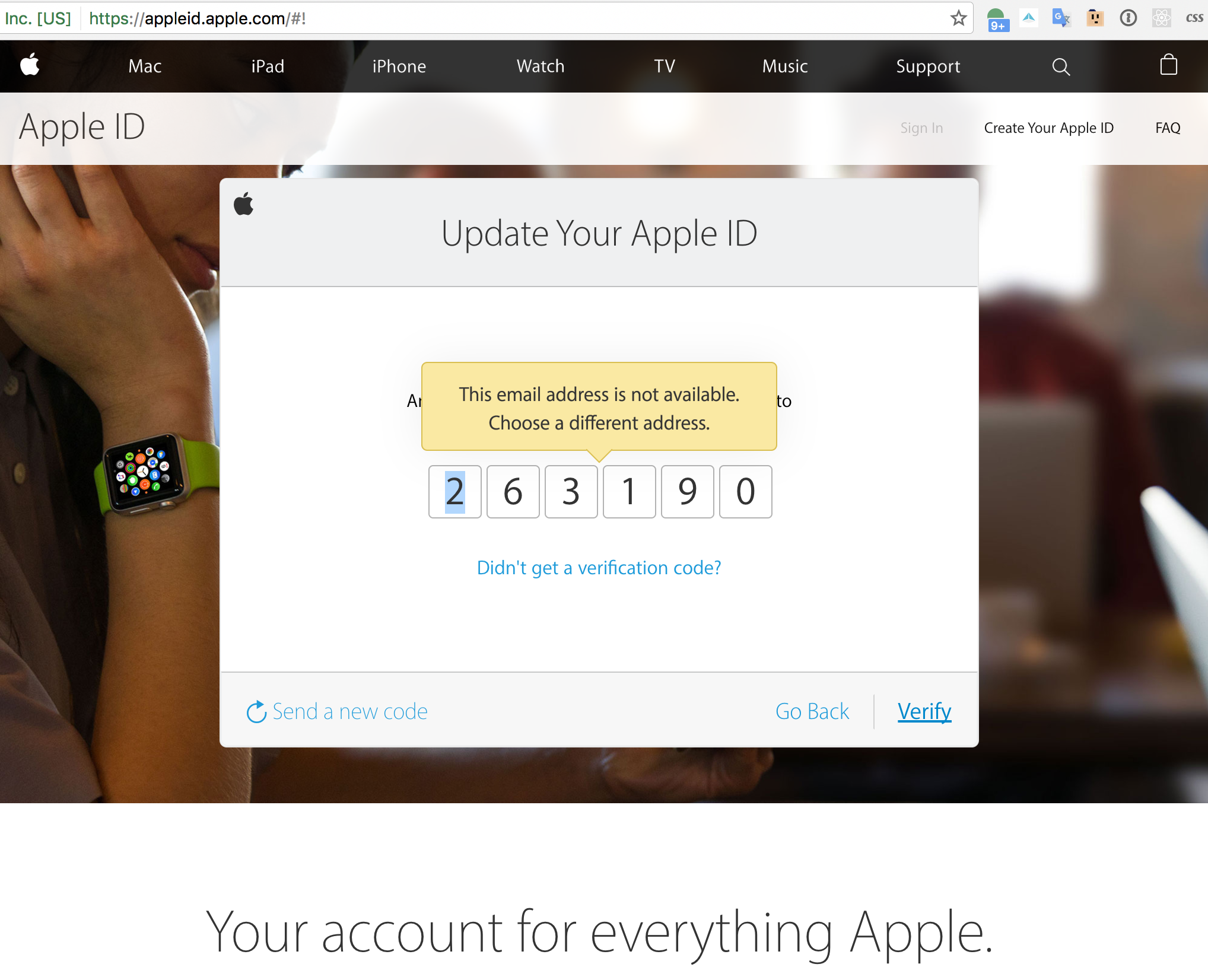 Entering 6 digit verification -> "This email address is not available. Choose a different address." !?