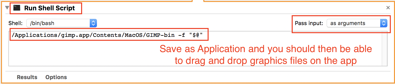 However, I haven't figured out yet the work flow (with Automator?) to get a "Gimp-script-start-icon" including the above command sitting on my desktop that can be click-started by the user.
