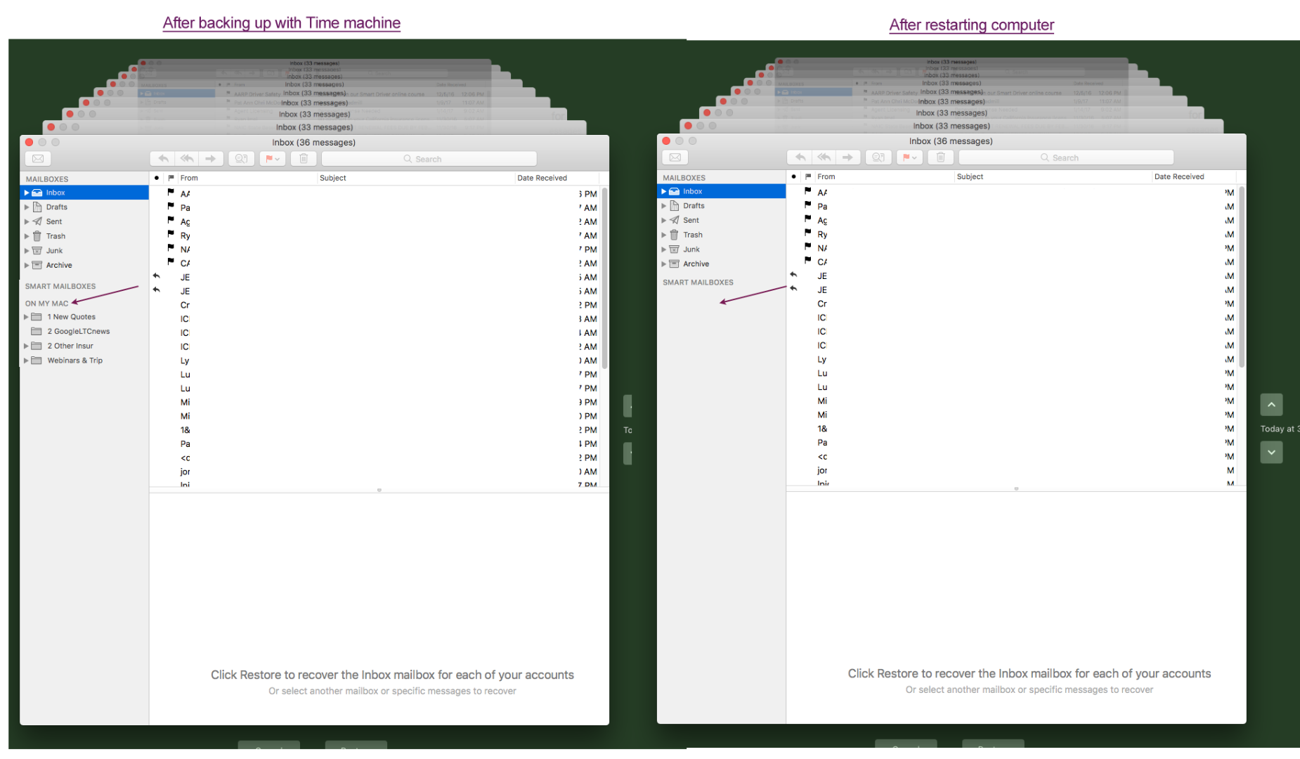 When I restart my MBPro2016 Sierra 10.12.2 Time Machine will not show "On My Mac" folders/emails for previous backups.