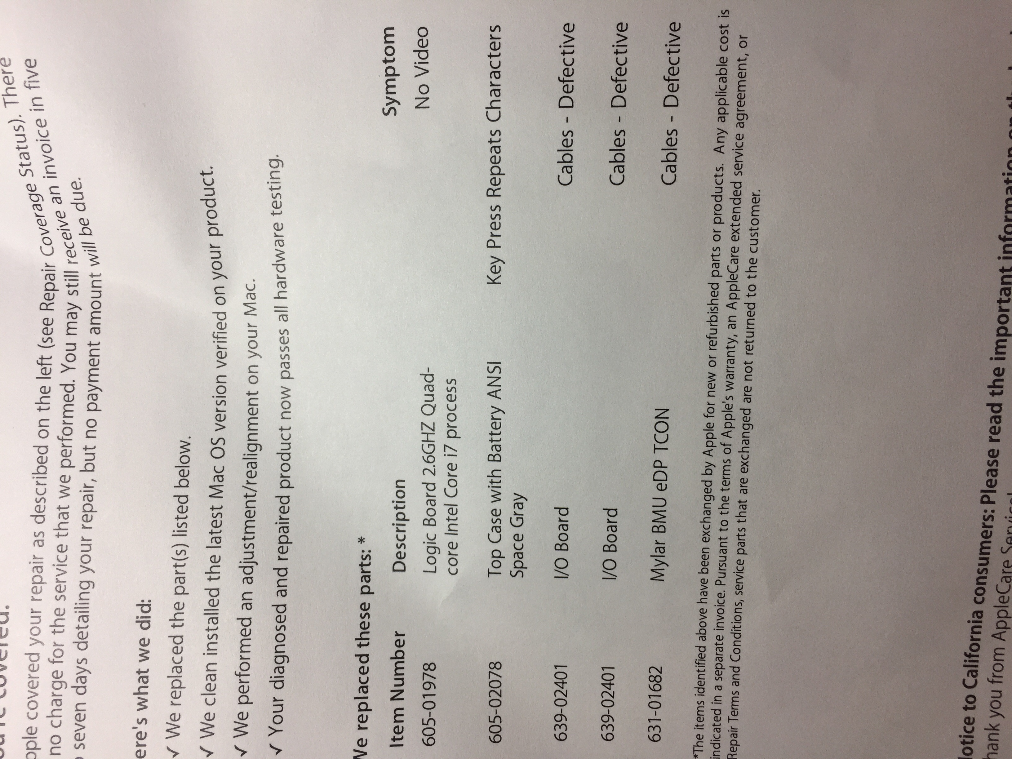 I received my 2016 MPB 15" back from service just last Friday. It took about a week for the repair. They replaced the entire top half of the laptop - it's all glued together as a single piece. New keyboard, battery, touchpad, touchbar & top half.