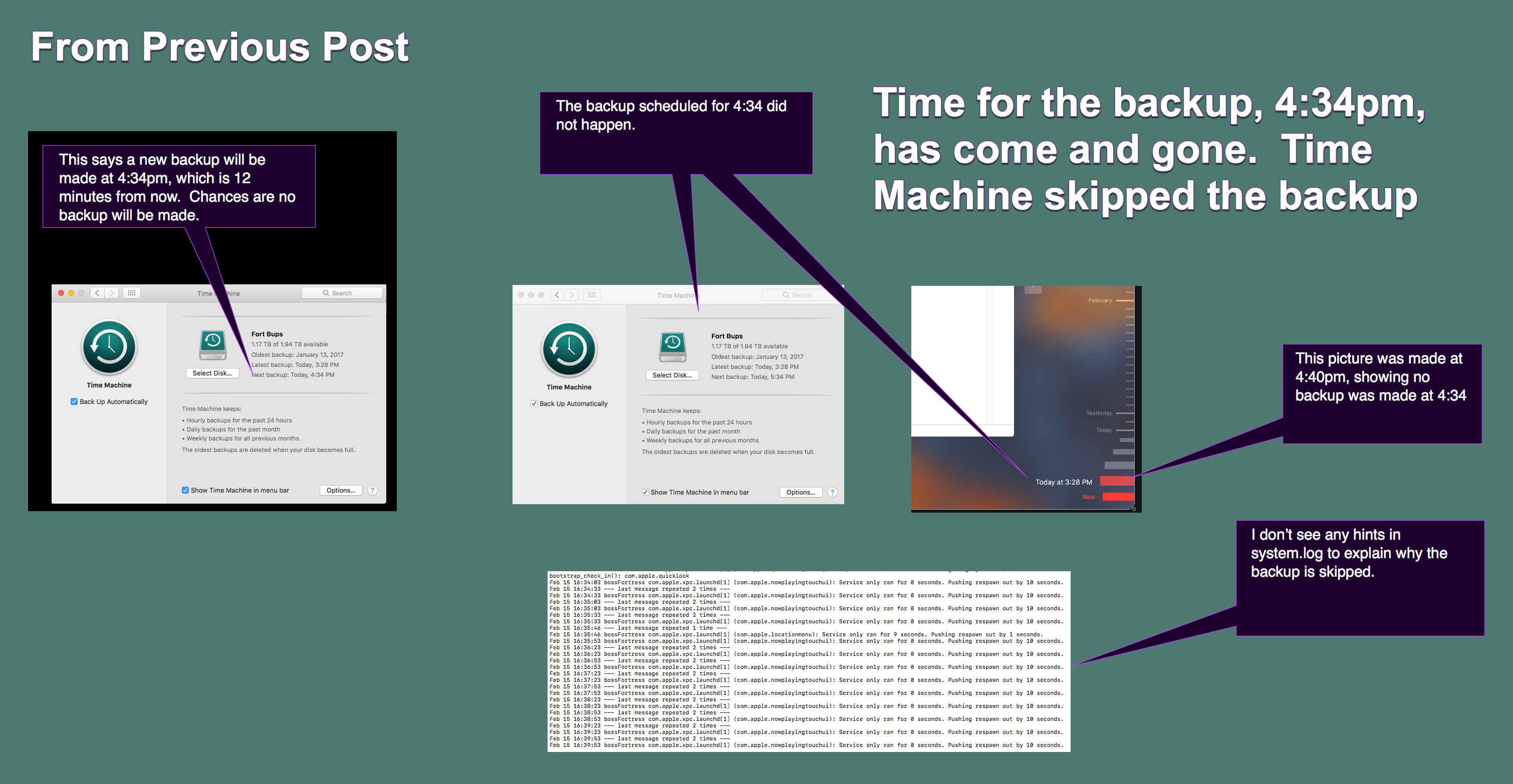 Regarding the skipped backup at approximately 0420 on your system, that is actually within my knowledge sphere. Events expected but not occuring at 0420 is a sign of positive system adaptation, a form of artificial intelligence. Basically. it means the dudes working inside the computer, who are our true heros, even more than some first responders, are taking care of business.