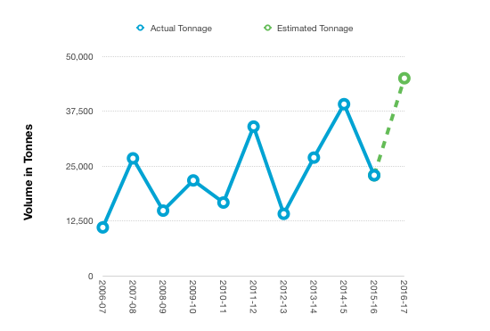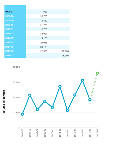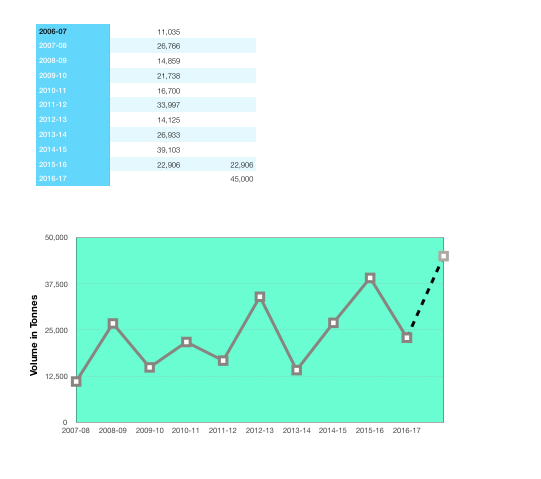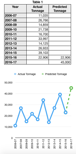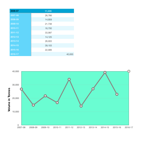 To create this chart, enter the data as shown. Select cells B2-C12, then choose the Line Chart from the Charts button menu. (Note that the category labels for the x axis are in a Header column.)