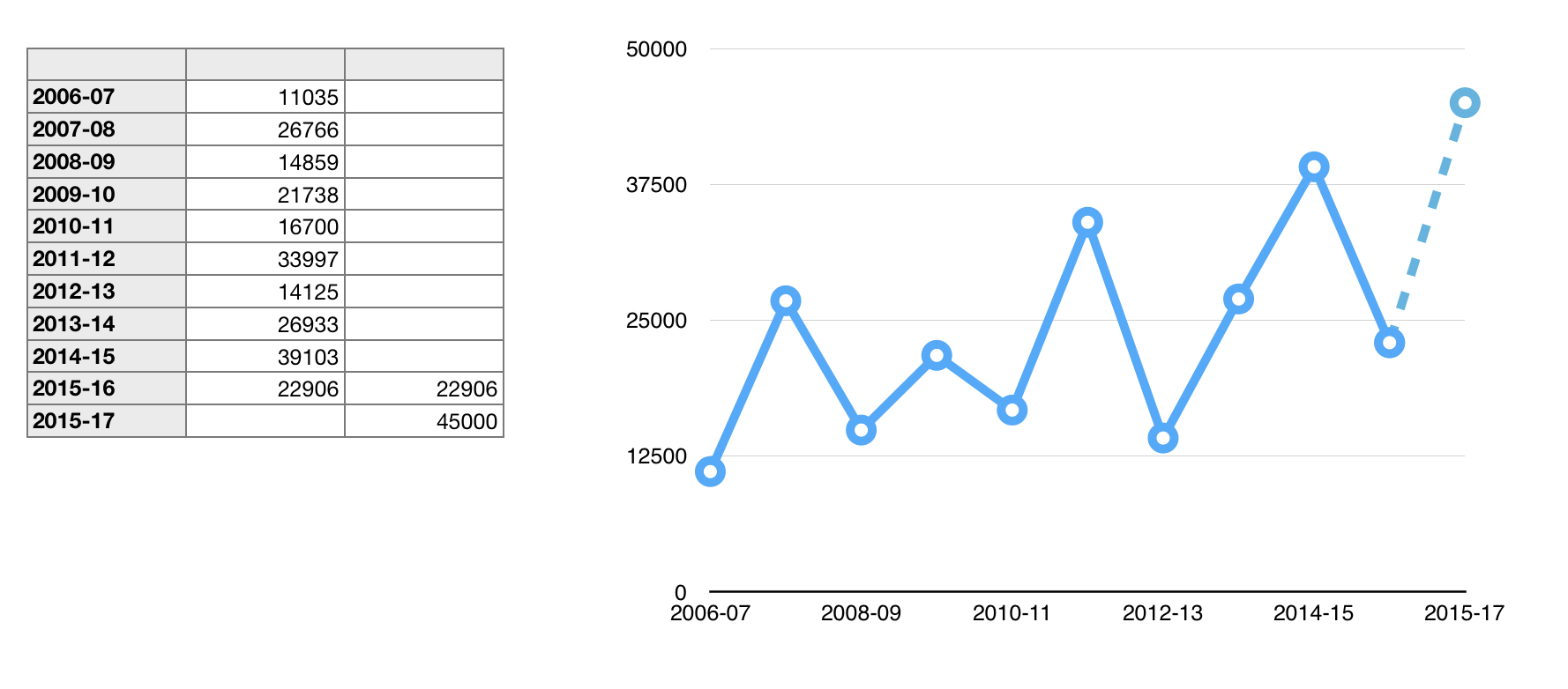I changes the Stroke of the last connecting line from solid to dashed, and the colour for that line and it's data point symbols from the default green to the same blue as the first series.