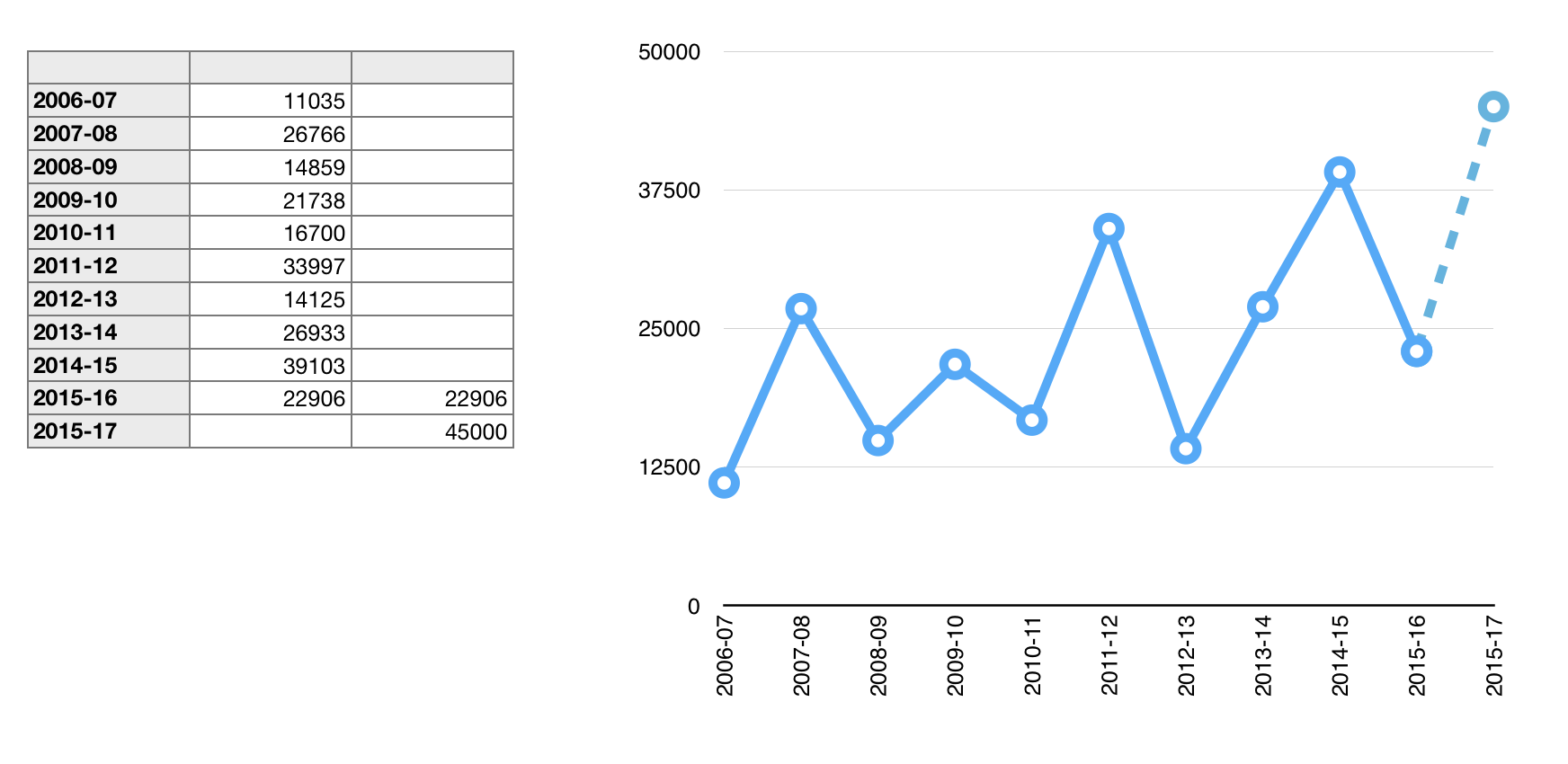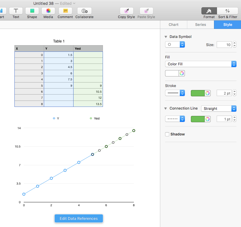 I changes the Stroke of the last connecting line from solid to dashed, and the colour for that line and it's data point symbols from the default green to the same blue as the first series.