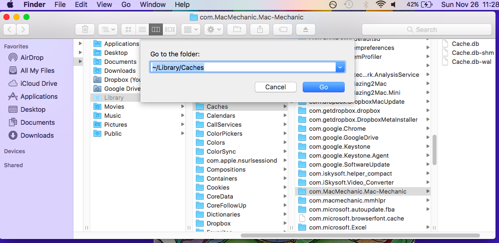 I don't know much about computers so it took me a while to figure out how to access this caches (It is hidden in finder's usual file flow...WHY?), but I eventually was able to find it in finder. On the apple finder menu I clicked "Go" and then "Go to Folder" at the bottom of the drop down menu. Then I typed "~/Library/Caches". I discovered that you must use the "~" symbol. Otherwise, you will see the wrong caches. Screen shots below: