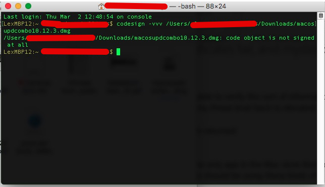 I ran codesign -vvv on my download package of macOS Sierra 10.12.3 Combo which returned ".../macosupdcombo10.12.3.dmg: code object is not signed at all"