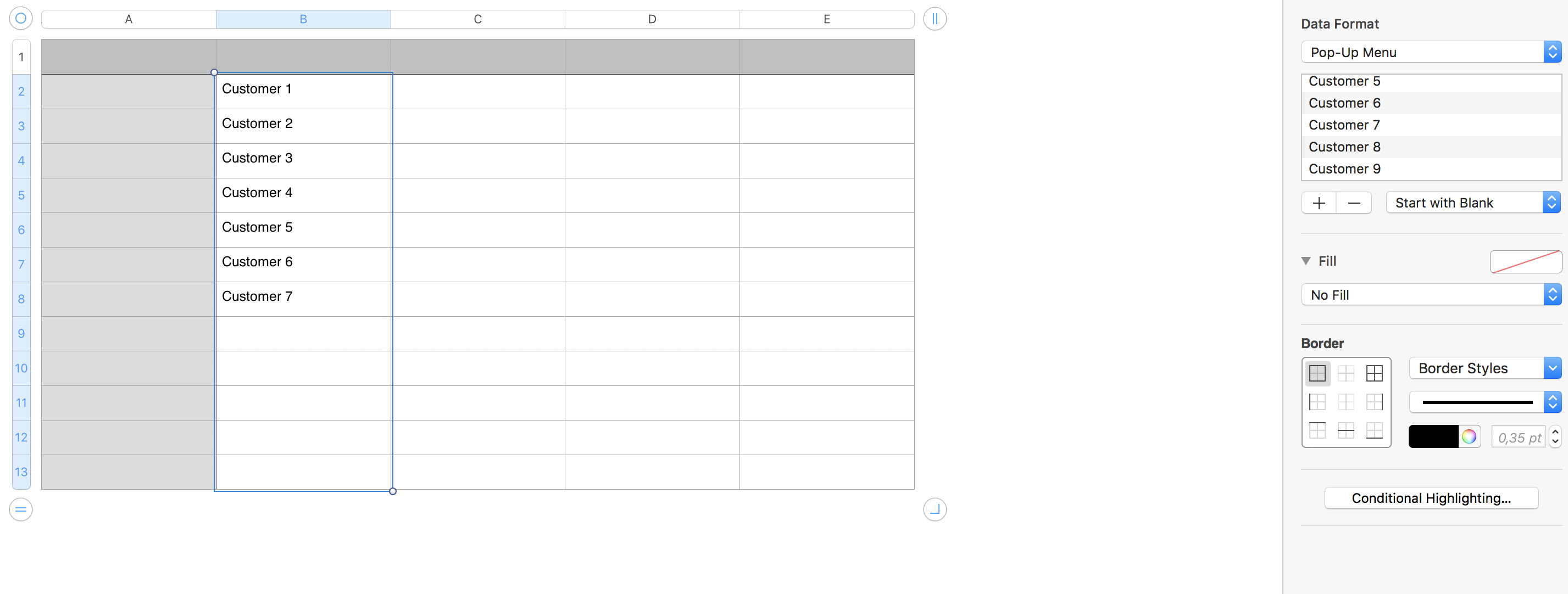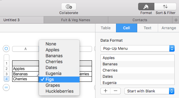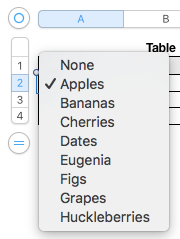 If I'm understanding your description, you have made the list in column B of the table shown, then selected the cells containing the list and changed their format to "Pop-up Menu".