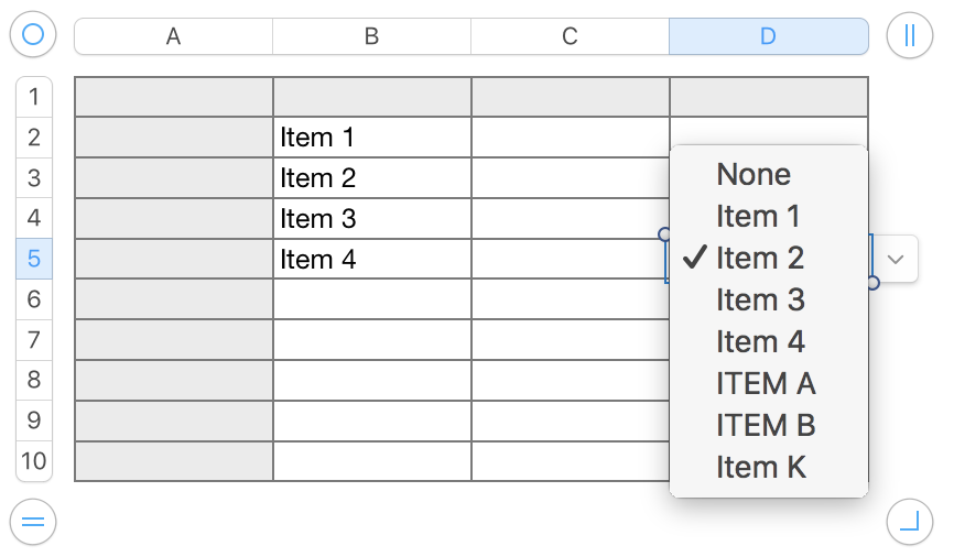 All cells containing data started with the list in B2:B5. After pasting three into D3:D5 (D5 selected), ITEM A an ITEM B were added to one menu, and in a separate edit, Item 2 in the menu n B4 was edited to Item K.