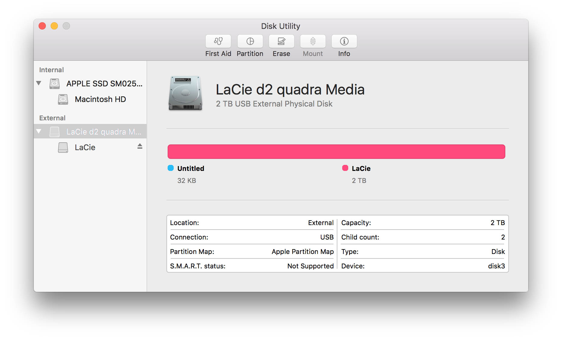 Disc Utility opened on Laptop B running El Capitan (10.11.6). Note the 32 KB in the "higher" drive.