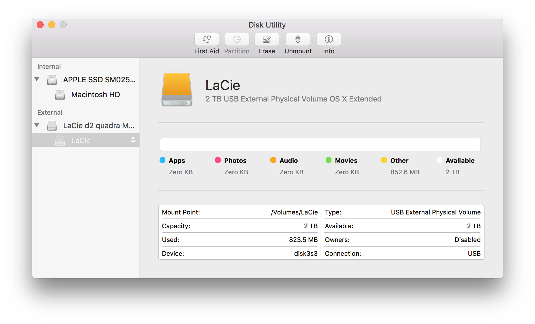 Lower disc selected in Disc Utility (laptop B) note the 852.6 MB.