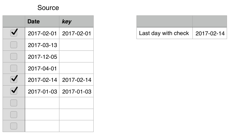 Create a row somewhere (beside the dates if you like, or elsewhere if you prefer). In a cell out of the way somewhere, enter a date that's guaranteed to be older than anything your spreadsheet will ever see. Then, in the cell that corresponds to the first date and checkbox you have, type: