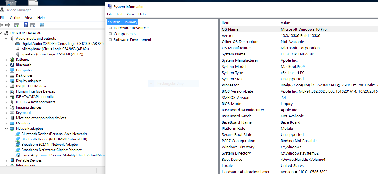 Notice the Cirrus Audio devices and the BIOS Mode shown in the following image. Audio works.