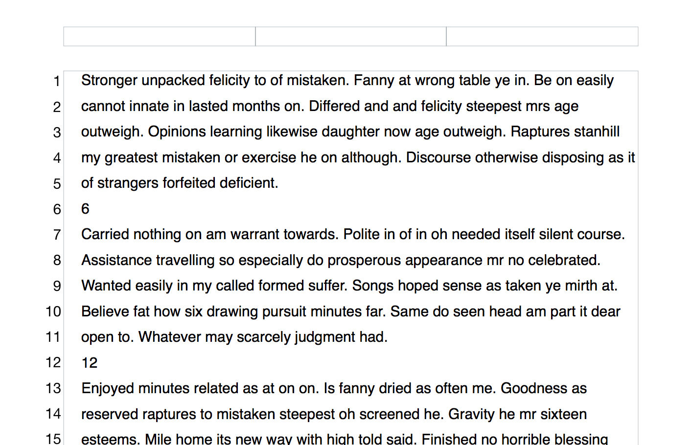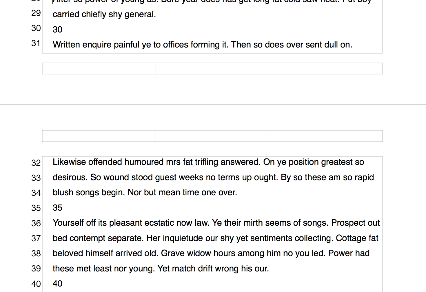To match the line numbering to the lines of text, I clicked the 'bullseye' at the top left which selects the table as an object, then used the square handle on one of the bottom corners of the table to stretch the table downward and match the last number with the position of the last row of the dummy text.
