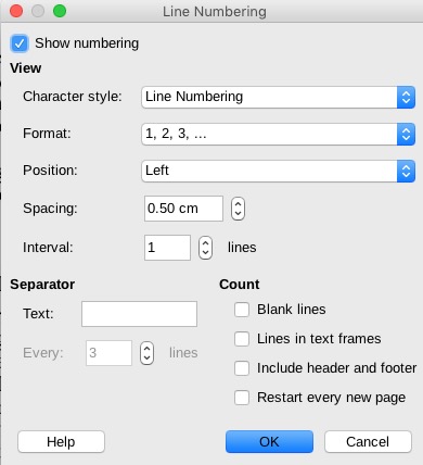 I am required to have a document that has continuous line numbers. Is there an option in Pages to add it?