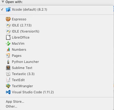 I have installed Visual Studio Code from Microsoft in order to edit xml (.xml) and Javascript files (.js) which it seems to do very well. I would like to set it as the default for opening these types of files, but when I try and set it as the default, I only get the option to choose an app from the Applications folder, and Code isn't listed.
