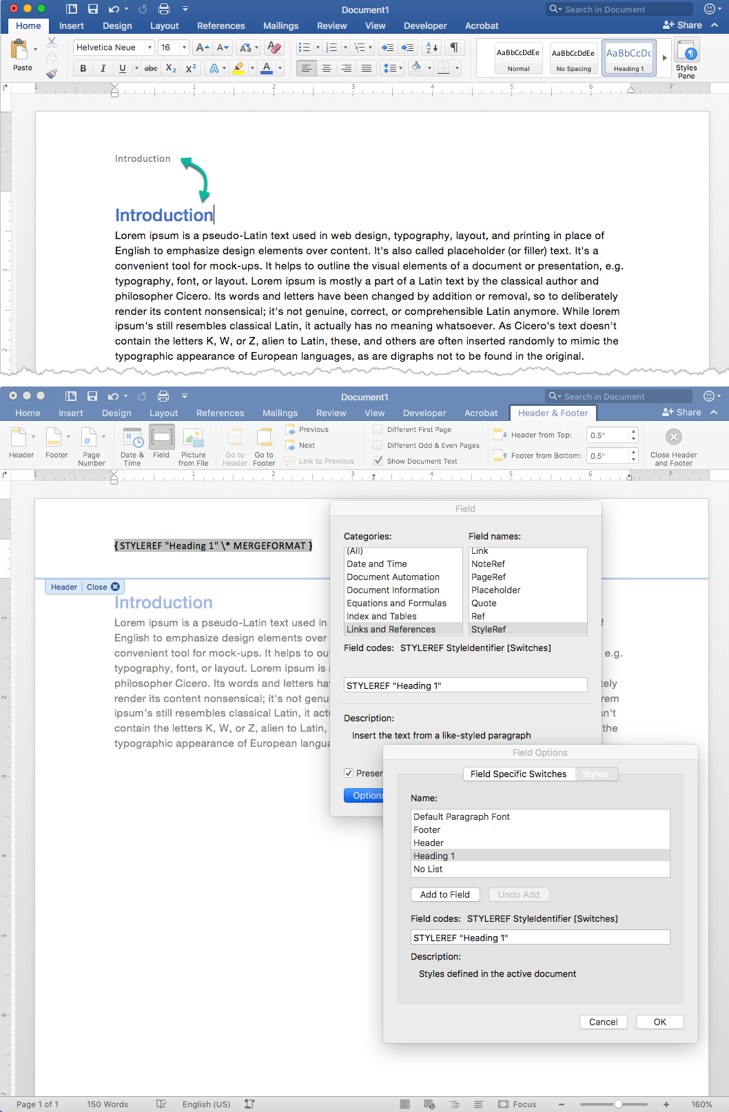 You can add section names to page headers (or footers) using Copy/Paste or Copy/Edit>Paste and Match Style (which would change the size and colour of your example "Introduction" to match the style used in the page header).