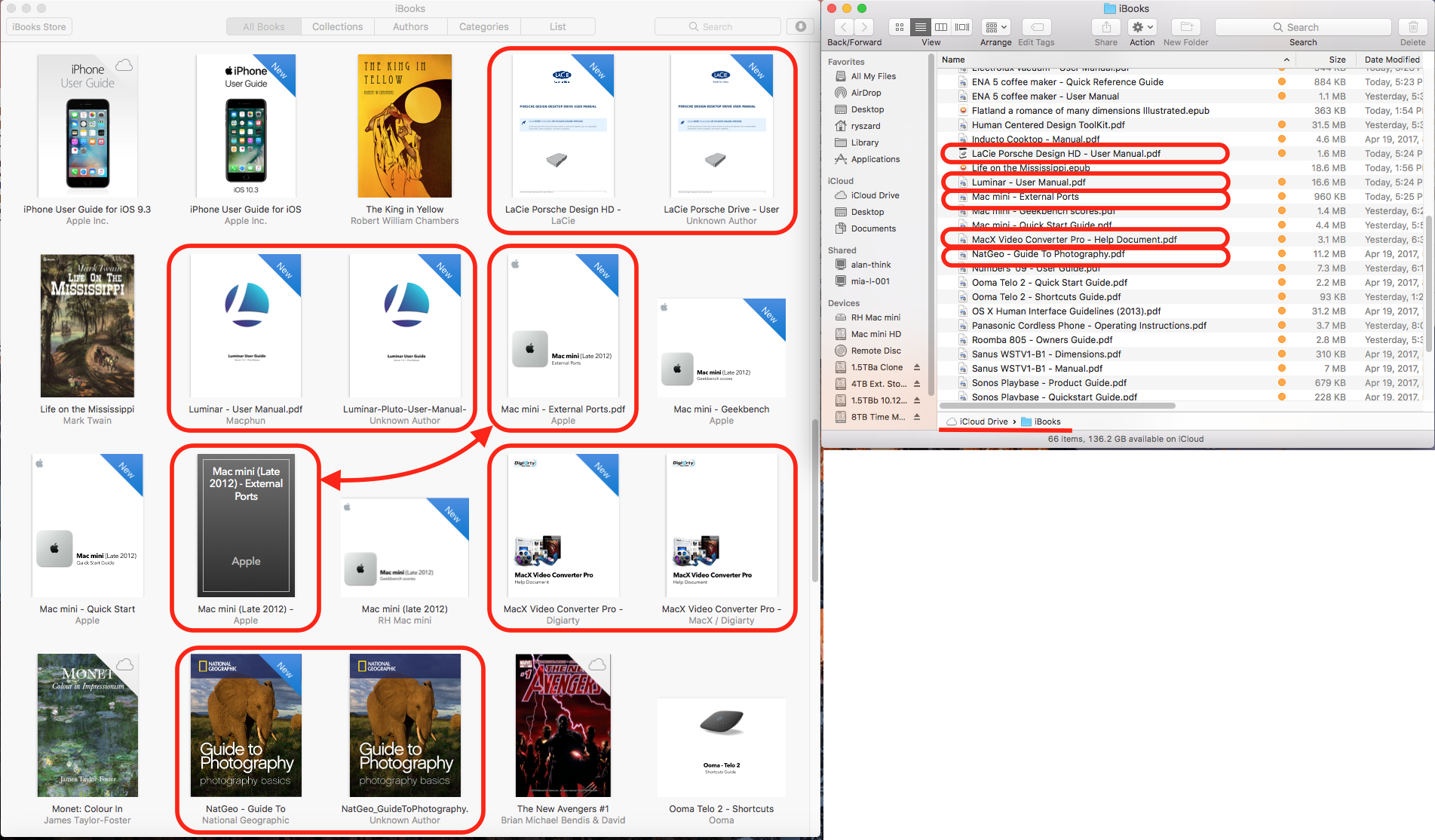 iBooks displays (lists) duplicates of many of my PDF files, which then also appear on my iDevices via iCloud Drive syncing. Deleting any one of the two file listings deletes both "copies." Adding even a revised version of the PDF file back to iBooks "resurrects" both listings, even when the updated file name, title and/or contents have been modified. In this case both, the older and the newer file will be listed separately and in icon view either the old cover, or a generic cover may appear. Double-clicking on either file, opens the same newer version. This is in-spite of the fact that only one file is present at