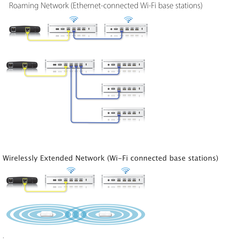 If you are using additional repeaters (Routers in bridge mode), these generally should be wired with Ethernet cabling. If you are relying on over-the-air forwarding, you generate so much Router-to-Router traffic that it can strongly inhibit your ability to get regular data through. The top diagrams are the correct way to set this up for an office -- using the bottom "Wirelessly Extended" diagram is a stopgap for use in low-traffic areas when there is no other alternative.