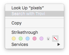 When I do right click on a selected word or text, an option called "Search With Trovi" appears, as in the following screenshot: