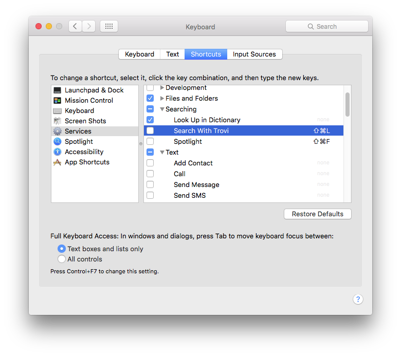 Despite of that, in System Preferences > Keyboard > Shortcuts > Services > Searching, there is a box "Search With Trovi", no need to say, I uncheck the box without any change.
