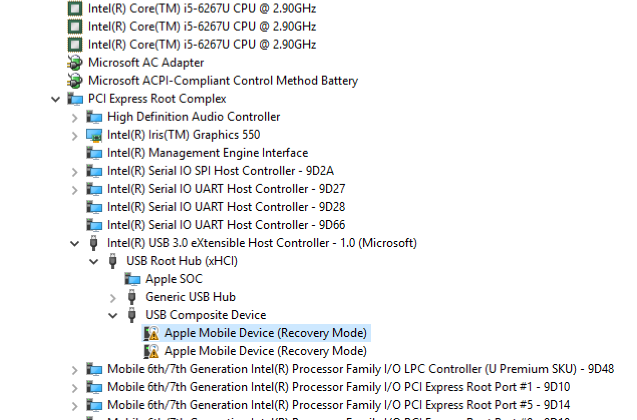 If it helps/ is pertinent I have two drivers which are getting warning symbols, I don't know exactly what that means. The drivers are both named Apple Mobile Device (Recovery Mode) and are both listed in Other Devices.