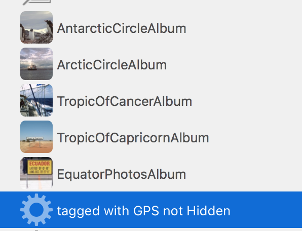 Just for the fun of it and as an example for scripting the GPS properties I wrote this little script to search for photos taken along the five major circles of latitude: the equator, the Arctic Circle, the Antarctic Circle, the Tropic of Capricorn, the Tropic of Cancer.